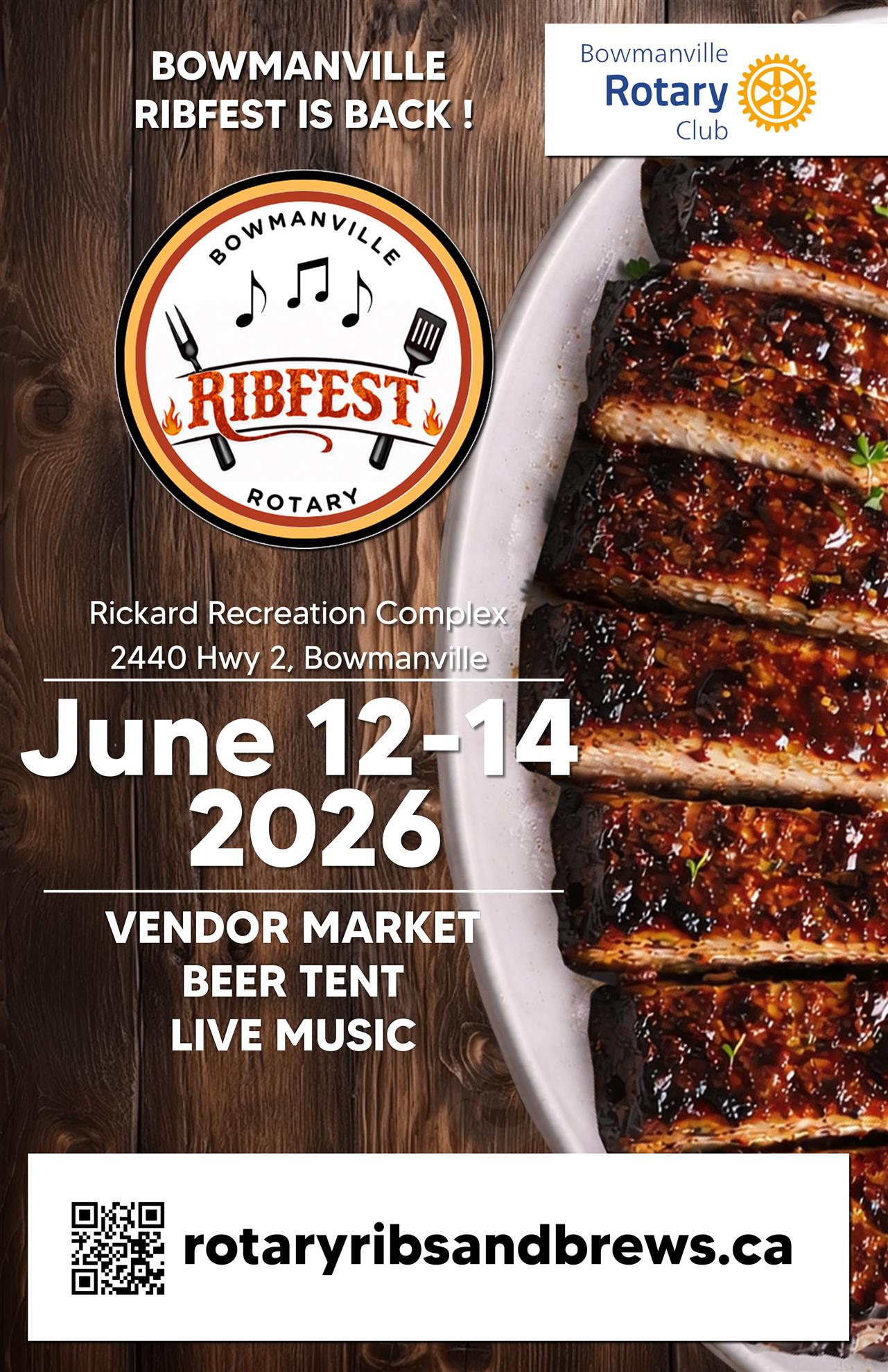 After a year off, one of our community’s most-loved summer traditions returns! The Bowmanville Rotary Club is excited to welcome everyone to Ribfest 2026, happening June 12–14 at the Rickard Recreation Complex—the very site of our first-ever Ribfest over 15 years ago.
